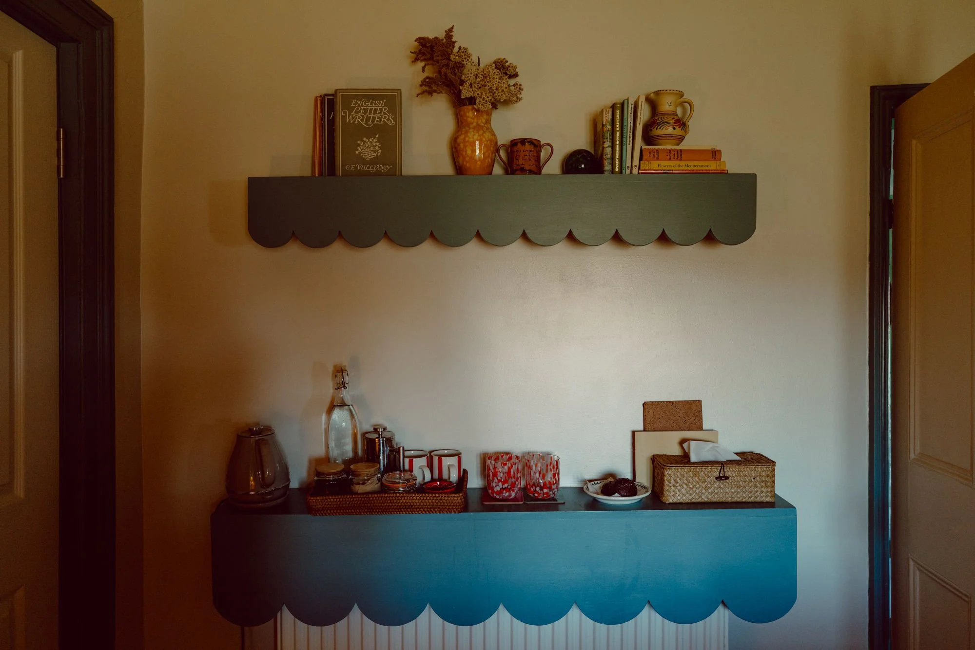 Characterful and cosy with a comfortable French antique standard double bed, Ottoline de Vries tulip wallpaper and original art. The Tulip Room has a view from the west side of the house and surrounding hills, with an en suite rainfall shower bathroom.
